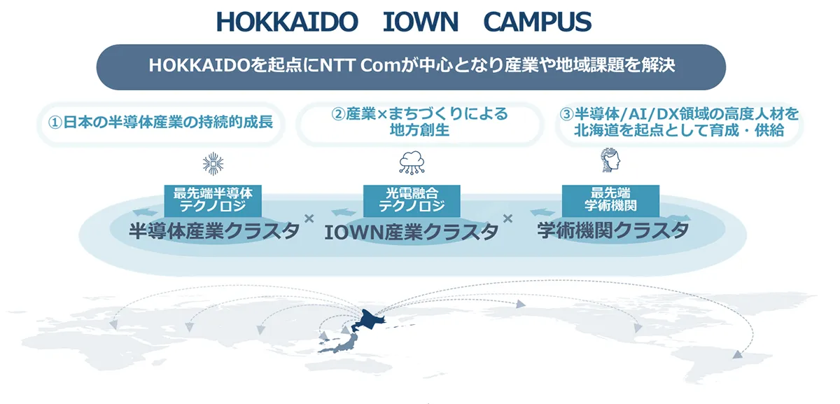 NTTコミュニケーションズ株式会社(以下 NTT Com)は、北海道を起点とし、さまざまな産業や地域課題を解決する事業コンセプト「HOKKAIDO IOWN CAMPUS」を発表します。産業振興×まちづくりにIOWN※1を活用し、半導体産業をはじめとするさまざまな産業/地域課題を解決し、北海道の地方創生に貢献していきます。