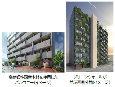 本物件は、「ZEH M-Oriented※」対応に加え、外装材への高耐候性国産木材の使用のほか、隣接する阪急京都線に面する共用廊下側にグリーンウォールを配置します。これらにより入居者や敷地周辺にお住まいの方だけでなく、鉄道利用者にも車窓から木質空間や緑を実感いただける計画としました。