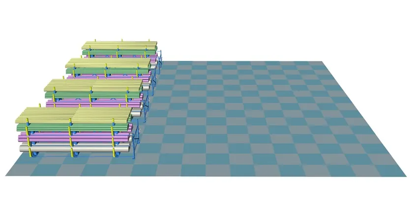 床置きの場合、荷物を置く場所が横方向に広く必要になりますが、段積みすることで建物の高さ方向が有効活用でき、床置きと同じ量の長尺材を半分以下の面積で保管できます。