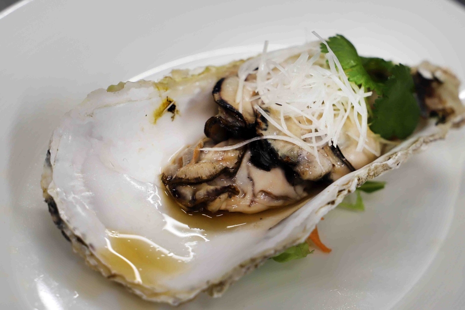 殻付きのまま蒸し上げた牡蠣に、香り高いネギと生姜を合わせた一品。