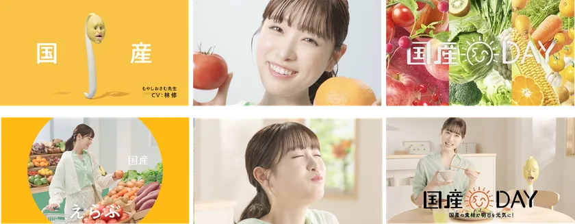 カメラに向かって「私は今日も」と問いかける高橋ひかるさん。「国産ですね?」と答えるもやしおさむ先生に、「そう!、“国産DAY”です♪」と明るく返すと、国産の食材を手に取り「選ぶ」、料理する「つくる」、美味しく「食べる」高橋ひかるさんが「国産食材をいつもより多めにプラス!おいしく食べて健康のためにも」と解説。もやしおさむ先生は、「いいでしょう!」と賛成。最後にはお二人が元気に「続けよう、国産DAY!」と呼びかけます。全国の食卓に笑顔を届けるテレビコマーシャルになっています。