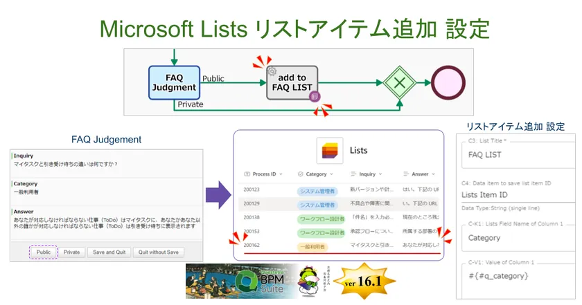 新バージョン16.1では、Microsoft Lists の「リスト」に「リストアイテム」(行データ)を追加する自動処理工程を、ワークフローに組み込むことができます。例えば、サイトへの FAQ 追加業務が Microsoft Lists の “FAQ作成” リストで管理されている場合、問合対応フローでの対応結果が “FAQ作成” リストに自動追加される仕組みを構築できます。