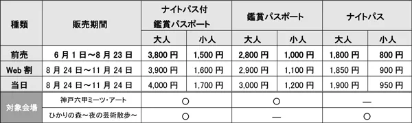 ※ナイトパス付鑑賞パスポートは神戸六甲ミーツ・アート2024 beyondの有料会場≪ROKKO森の音ミュージアム、六甲高山植物園、トレイルエリア(新池・バンノ山荘・ヤンセンアトリエ)、風の教会エリア≫への入場と、「ひかりの森~夜の芸術散歩~」への入場がセットになったパスポートです。