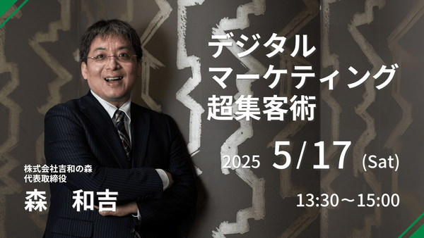 デジタルマーケティングのコンサルティング・運用サービスを提供している「株式会社吉和の森」(本社:東京都港区 代表取締役:森 和吉)の代表取締役・森 和吉が、デジタルハリウッドSTUDIO青森5月イベントで登壇します。5月17日(土)13:30から現地開催&オンラインで開催されます。