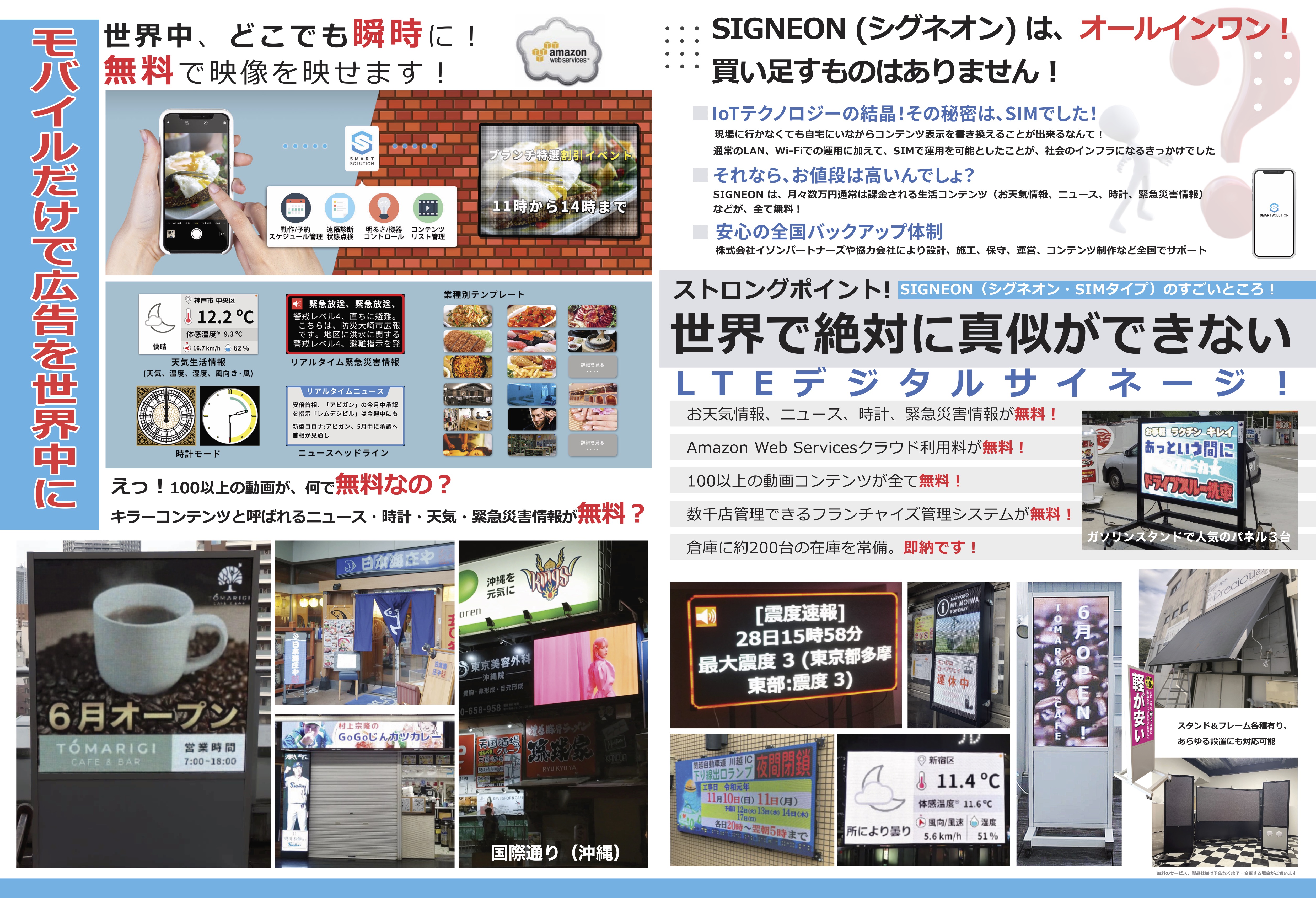 他、お天気情報・主要ニュースなどの生活情報表示から緊急地震速報の割り込み表示も可能なため単なるデジタル広告看板というだけではなく「地域貢献」ができるものとなります。