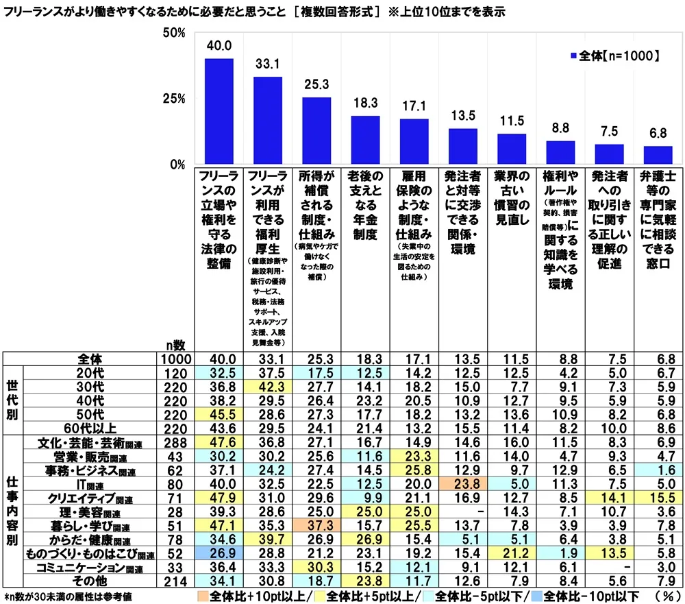 全回答者(1,000名)に、フリーランスがより働きやすくなるために必要だと思うことを聞いたところ、「フリーランスの立場や権利を守る法律の整備」(40.0%)が最も高くなり、「フリーランスが利用できる福利厚生(健康診断や施設利用・旅行の優待サービス、税務・法務サポート、スキルアップ支援、入院見舞金等)」(33.1%)、「所得が補償される制度・仕組み(病気やケガで働けなくなった際の補償)」(25.3%)、「老後の支えとなる年金制度」(18.3%)、「雇用保険のような制度・仕組み(失業中の生活の安定を図るための仕組み)」(17.1%)が続きました。