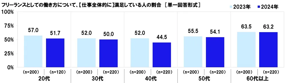 昨年の調査結果(※)と世代別に比較すると、満足している人の割合はいずれの世代でも下降しており、40代では7.5ポイントの下降(2023年52.0%、2024年44.5%)と下降幅が最も大きくなりました。