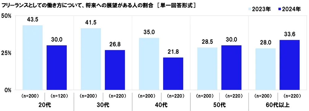 ◆フリーランスとしての働き方についての将来への展望 比較的若い世代で昨年に比べ大幅な下降