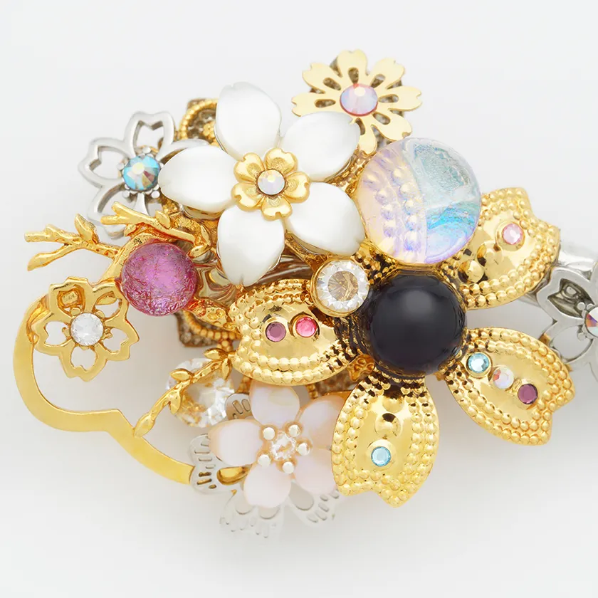 京都の自社工房にて職人が一粒一粒丁寧に焼き上げたヴェネチアンガラスをベースに焼き上げた「京ガラス」を使用し、100を超える繊細なパーツやモチーフと組み合わせ、おもわず目を惹くような絢爛豪華なデザインに仕上げました。すべての工程を京都の工房で手作りしています。