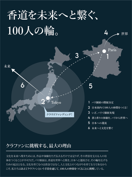 ゆえに本プロジェクトは、作品を見せることや一度きりの香席を開くことにとどまらず、「理解し、支え、育てる人の母体=100人の仲間」をつくることを第一の目的に掲げている。
