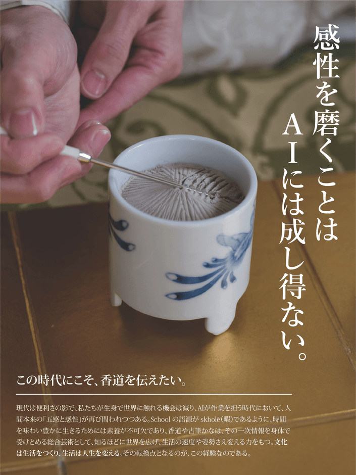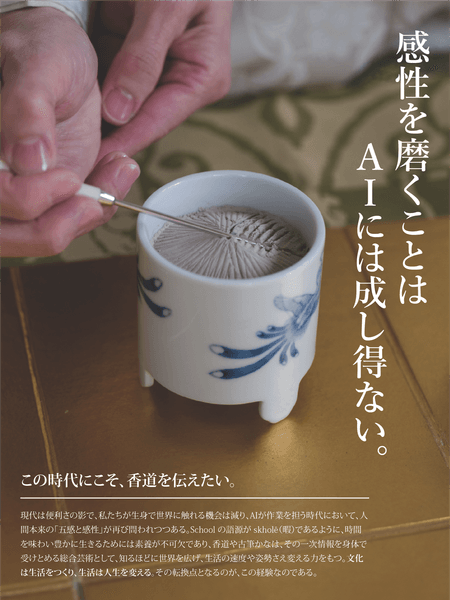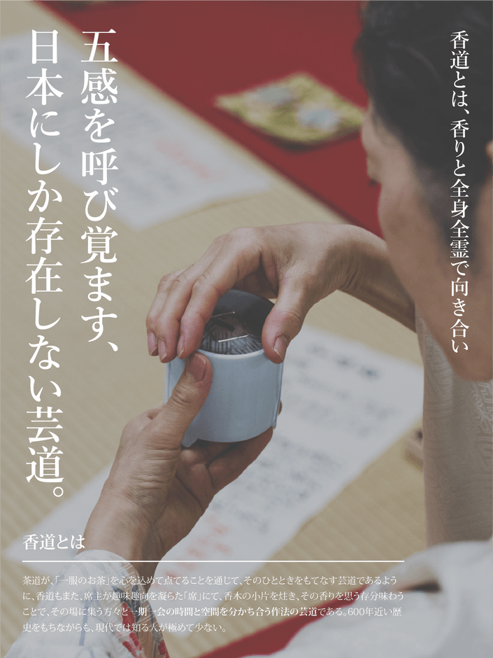 継承の担い手が限られ、香道具を支える職人も減りつつある今、このままでは香道の技法だけでなく、その精神性や感性の体系そのものが失われかねない。機能性・効率・わかりやすさなどといったキーワードが重視される現代のデジタル時代において、言語化しにくい〈曖昧さ〉や、理解に時間がかかる〈余白の美〉といった日本人ならではの美意識を扱う芸道は、可視化されにくいがゆえに周縁化されやすい。