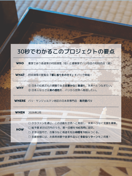 文化を未来へ残すためには、作品や体験を一方向的に届けるだけでは足りず、そこに込められた技法や精神性を理解し、継続的に支えていく「人の母体」が必要だと、村田清雪・百合は考る。ゆえに今回のパリ個展は、香道と古筆かなの世界を国際的な文脈にひらき、再び日本へ還流させるための起点として位置づけられている。
