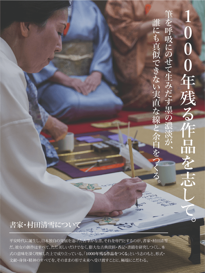 村田清雪は、日展常務理事・池田桂鳳氏に師事し、古筆かなを専門に研鑽を積んできた書家である。映画『武士の家計簿』や企業広告の題字、美術背景作品の揮毫、陶芸・日本画とのコラボレーションなど、その活動は多岐にわたるが、一貫して「1000年残る作品をつくる」という志のもと制作を続けている。