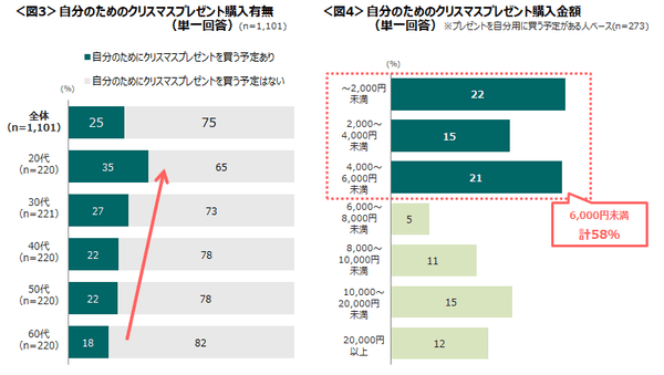 自分のためにクリスマスプレゼントを購入する予定がある人は25%。年齢が若いほど購入する予定があり、自分のために使えるお金の割合が多いためであると推察される。<図3>