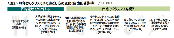 また、昨年と今年のクリスマスの過ごし方の変化を聴取したところ、こちらも「自宅で過ごす」という回答が散見され、その中でも「コロナ禍で外食を控えているため豪華にする、お取り寄せ・テイクアウトをする」といった回答が多く、状況にあわせてクリスマスを楽しもうという姿勢が見られた。<図2>