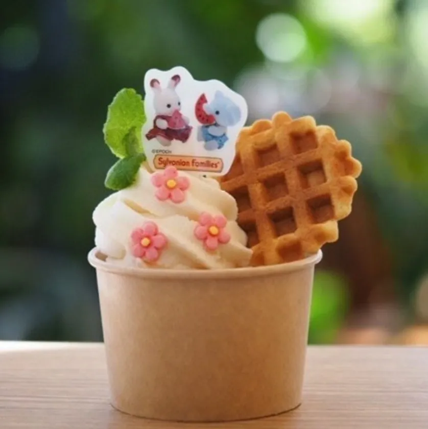 白桃の果肉入りソフトクリームにお砂糖のお花、ワッフルクッキー、かわいいシルバニアのピックに園内で収穫したハーブを盛り付けています。使用するソフトクリームは季節によって変わります。また、セットに付いてくる赤ちゃん人形のラインナップは花の文化園カフェレストランのInstagramアカウントのストーリーズでお知らせしています。