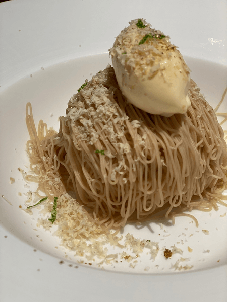サクサクのメレンゲとラム酒香る生クリームに和栗のマロンクリームをしぼり、バニラアイスクリームをのせて能登栗と金沢・湯涌(ゆわく)産の青柚子の皮をすりおろしました。フレッシュな柚子の香りをまとった、すっきりと食べられるモンブランです。