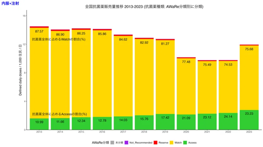 AWaRe分類については、WHOの定義するAWaRe分類のうちJ01に分類される抗菌薬を対象としています。