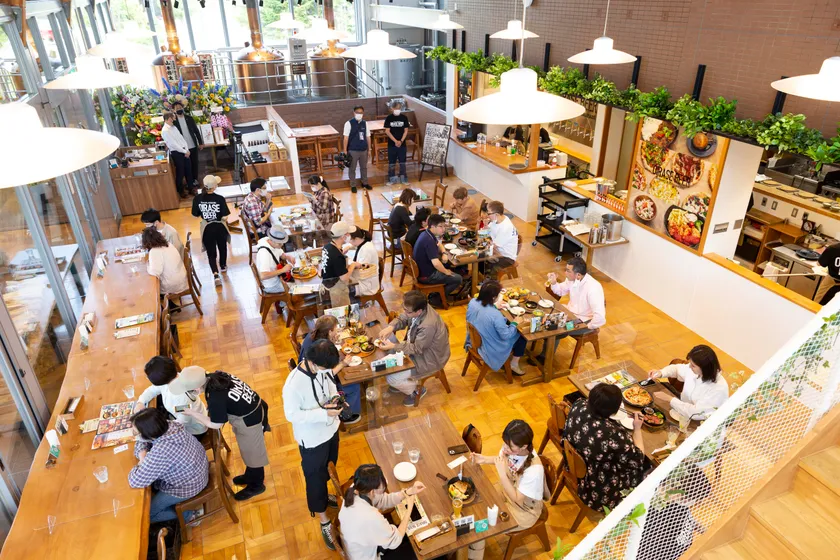 醸造所を間近で見ながら、天井が高く、光がよく入る居心地の良い空間。OIRASE BEERの生ビールと、石窯ピザを中心とした、青森県産食材の特徴を生かしたビールにマッチする料理を提供しています。