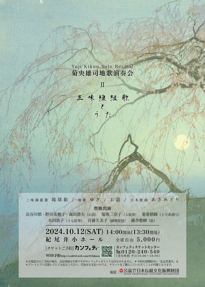 菊央雄司事務所主催、『第二回 菊央雄司地歌演奏会 〜三味線組歌 と うた〜』が2024年10月12日 (土)に紀尾井小ホール(東京都 千代田区 紀尾井町 6番5号)にて開催されます。
