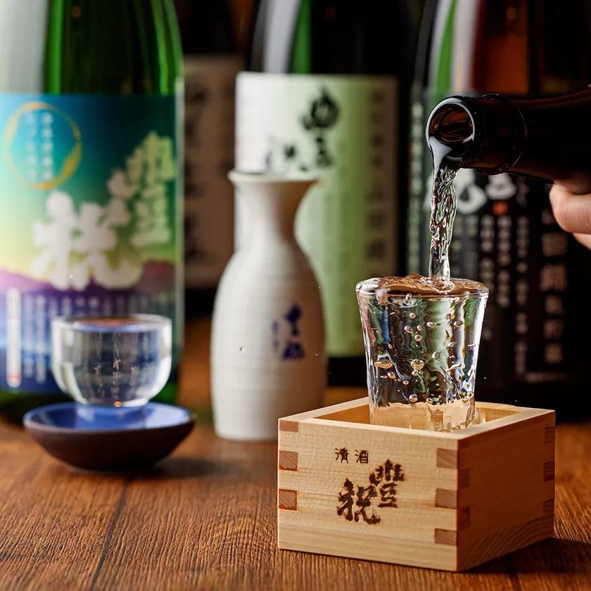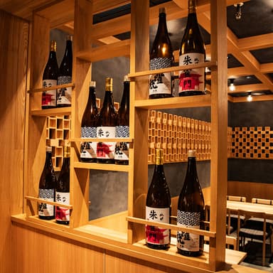 木と紺色を基調とした明るい店内には、枡を使った装飾や和紙の照明、日本酒のラベルをモチーフにしたのれんなどを飾り、女子会やデート使いにもおすすめです。