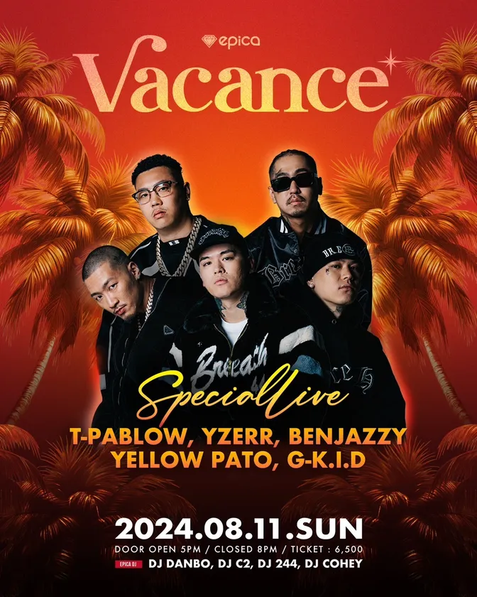 株式会社SEQUENCE(代表取締社長:高田 一司)が運営するナイトクラブ「エピカ」(所在地:沖縄県那覇市松山1-5-1 ナムラプラザビル3F)は、2024年8月11日(日)開催、スペシャルクラブパーティー『Vacance』にて『BAD HOP』の元メンバー、T-Pablow・YZERR・Benjazzy・Yellow Pato・G-k.i.dの5人の出演が決定しました。