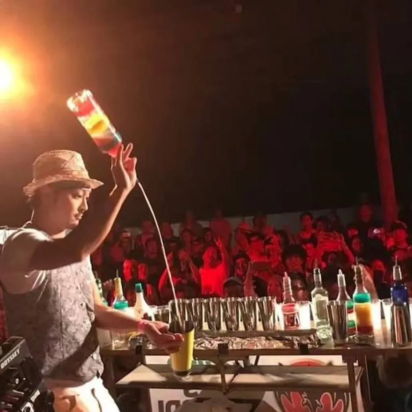 カクテルシェーカーが宙を舞う、プロフェッショナルなバーテンダーによる華麗なパフォーマンスをお楽しみください。