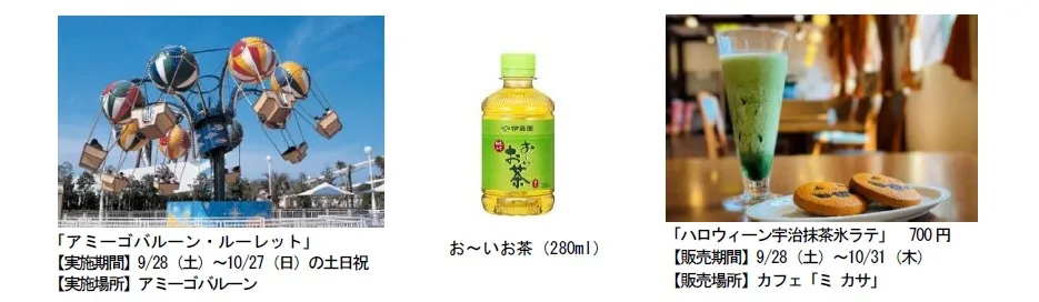 気球に乗り、風を感じながら空中散歩が楽しめるアトラクション「アミーゴバルーン」では、指定されたエリアに停止したバルーンにご乗車のお客さまに「お~いお茶(280ml)」をプレゼントするイベント「アミーゴバルーン・ルーレット」を日にち限定で実施します。またカフェ「ミ カサ」では、伊藤園の「お~いお茶 宇治抹茶」とのコラボメニュー「宇治抹茶氷ラテ」を販売します。緑鮮やかで口当たりの良い抹茶とまろやかなミルクが合わさった爽やかな味わいをお楽しみください。