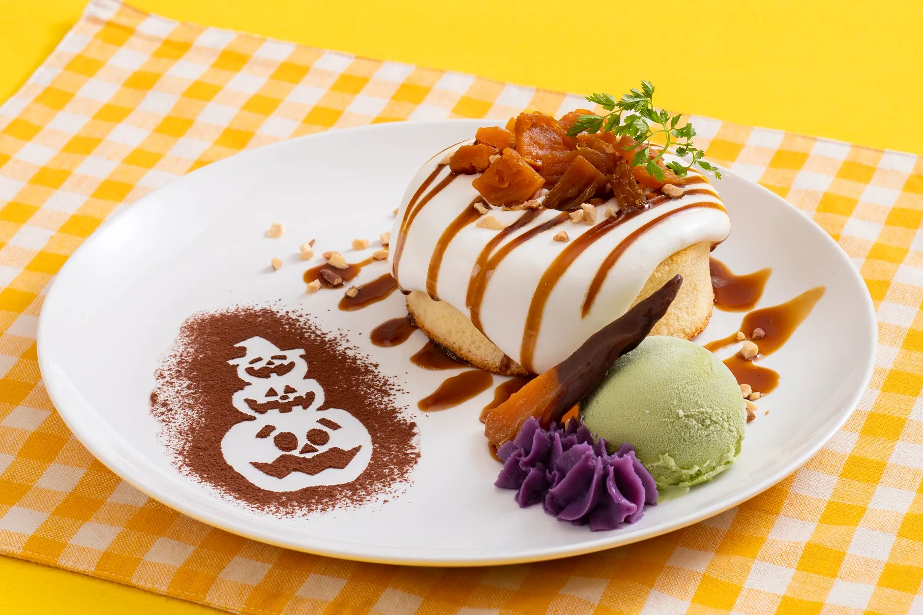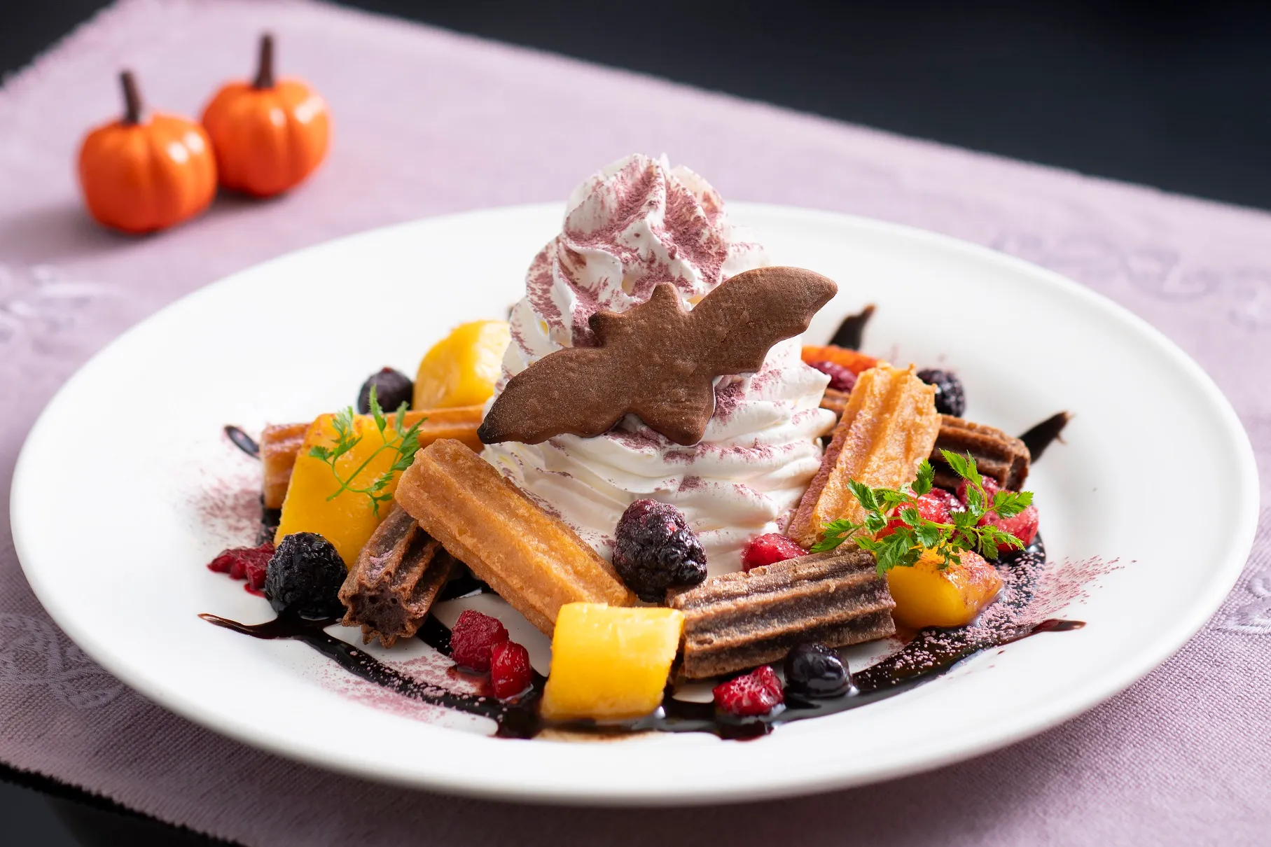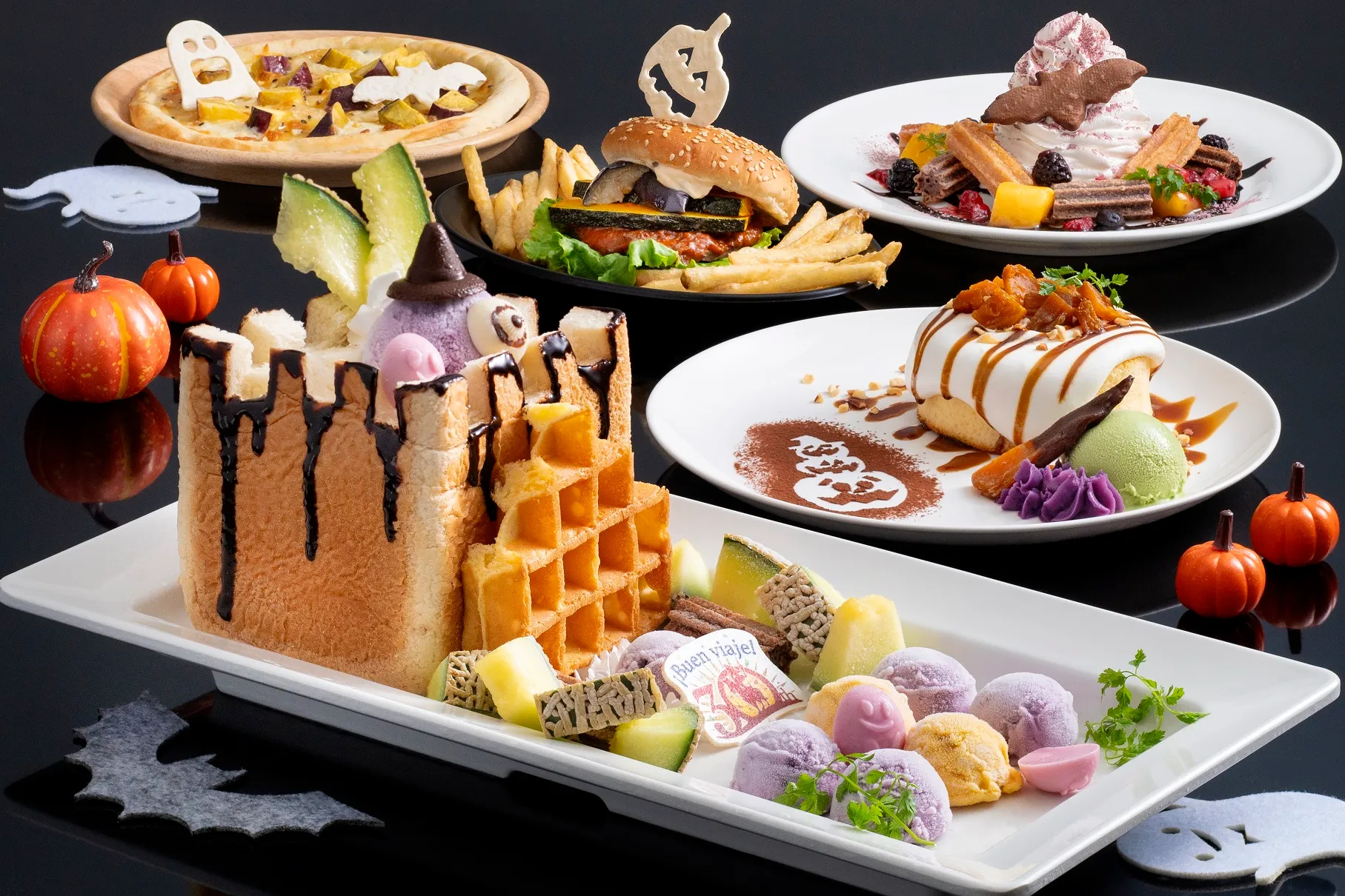 ジャックオーランタンやコウモリなどを飾ったハロウィーン気分が盛り上がるメニューが勢揃い。志摩の特産品「きんこ芋」を使ったパンケーキや、スペインのお菓子チュロスのスイーツプレート、トリュフが薫るハンバーガーなどが新登場します。