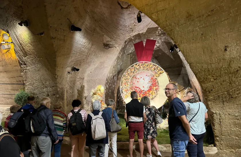 会場は19世紀までこの村の洞窟住居として使われていた洞窟で、高さ7メートル、幅と奥行き5メートルの広い洞窟空間の中から抽選で割り与えられた区画に、バラの生花1,000本を使用したスケールの大きな巨大フラワーアートを制作することが条件となります。花の技術に加え、空間演出・構造構築の能力が求められるハイレベルな国際コンクールです。今年のテーマは「バラとオリンピック」。世界から4人一組の代表チームが参加して芸術性や装飾能力を競い合い、2日間で作品を作り上げます。