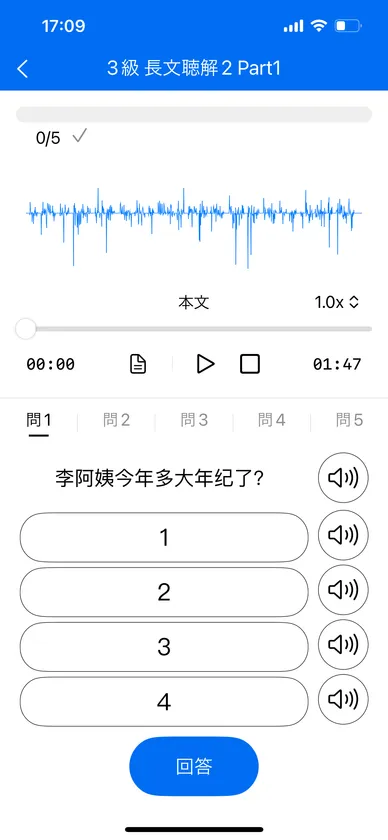 今回の収録内容は、中国語検定試験 準4級・4級・3級の第87回から第106回となります。各級の出題形式別にまとめて学習することができ、リスニングでは再生速度や再生位置を自由に変更できるなど、アプリならではの効率的な学習が可能です。中国語検定の試験対策に最適なのはもちろん、まだ受験は考えてないという方にも、中国語の地力をつけるためにおすすめのコンテンツとなっています。