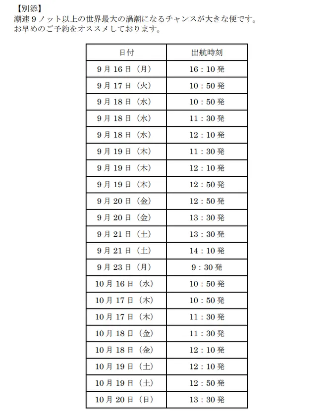 世界最大の渦潮を見るためには(1)大潮前後の日に、(2)その日の潮流の最強となる時間に、遊覧船に乗ることが必要です。うずしおクルーズのホームページでは、大潮の日や大うずの日がわかるカレンダーを掲示しています。また、その日の中で潮流が最強となる時間の便を◎で記していますので、大潮の◎の便で世界最大の渦潮にチャレンジしてください。ただし、波や風が強くなると渦潮が消されてしまう時があるので天候も重要となりますのでご注意ください。特にチャンスの大きな便は別添資料を添付しております。