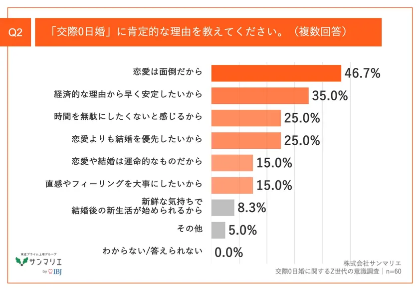 Q1で「とても肯定的」「やや肯定的」と回答した方に、「Q2.「交際0日婚」に肯定的な理由を教えてください。(複数回答)」(n=60)と質問したところ、「恋愛は面倒だから」が46.7%、「経済的な理由から早く安定したいから」が35.0%という回答となりました。
