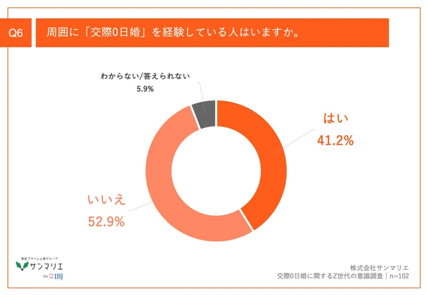 「Q6.周囲に「交際0日婚」を経験している人はいますか。」(n=102)と質問したところ、「はい」が41.2%、「いいえ」が52.9%という回答となりました。