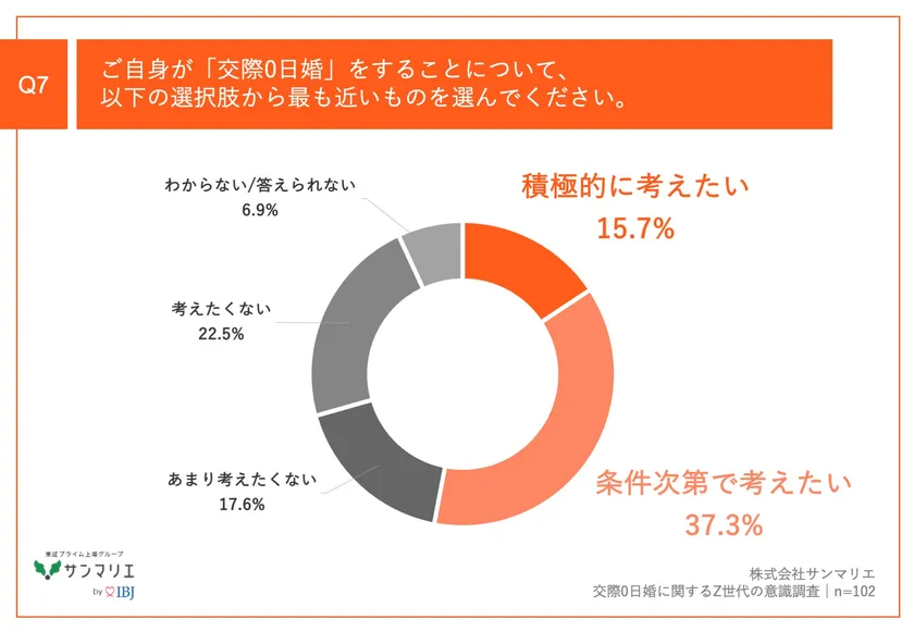 「Q7.ご自身が「交際0日婚」をすることについて、以下の選択肢から最も近いものを選んでください。」(n=102)と質問したところ、「積極的に考えたい」が15.7%、「条件次第で考えたい」が37.3%という回答となりました。
