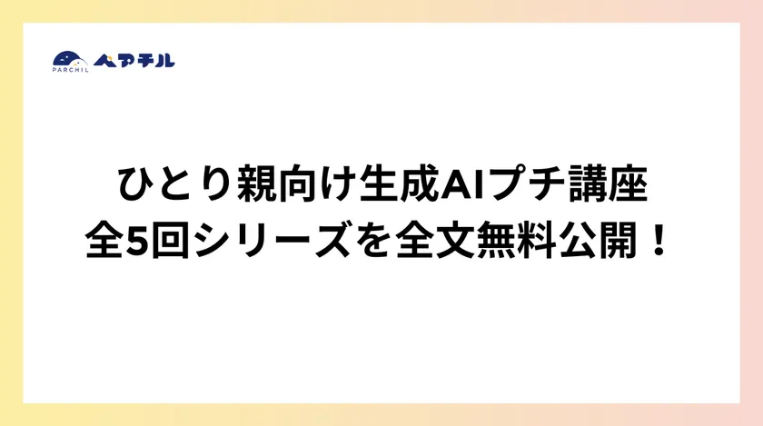 シングルマザー・シングルファザー向けのトークアプリ「ペアチル」の開発・運営をする一般社団法人ペアチル(非営利徹底型)(本社:東京都港区、代表理事:南 翔伍)は、ひとり親向け生成AIプチ講座全5回シリーズを全文無料公開しました。