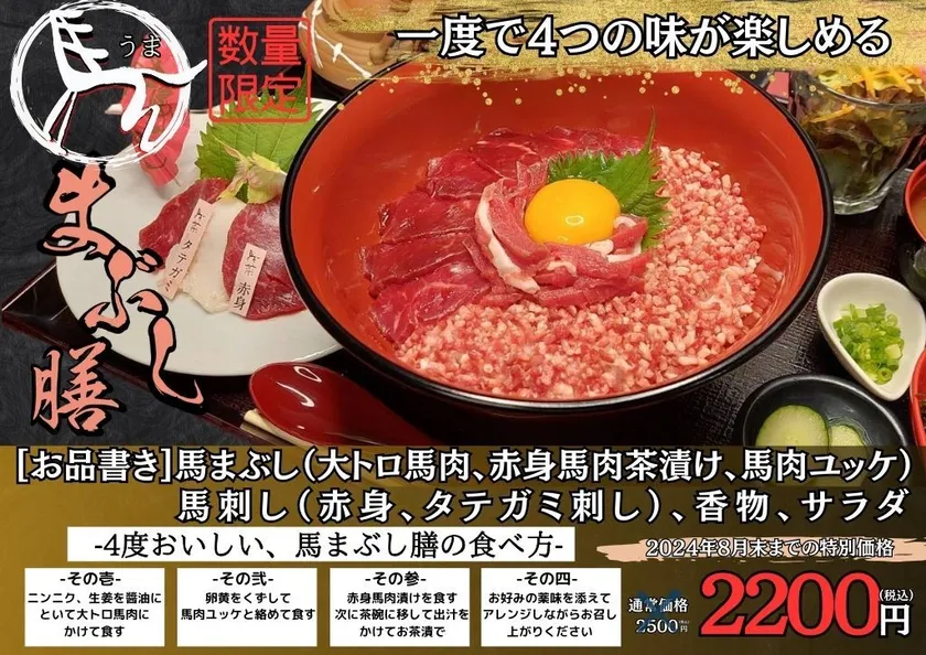 千葉エリア中心に飲食店を多数展開する株式会社傑さく(所在地:千葉県船橋市、代表取締役社長:田中 傑)が運営する、銀座に本店を構える馬肉専門店の「馬菜 千葉店」にて、2024年8月9日からランチ限定で馬まぶし膳(大トロ馬肉、赤身馬肉漬け、馬肉ユッケ)を販売します。