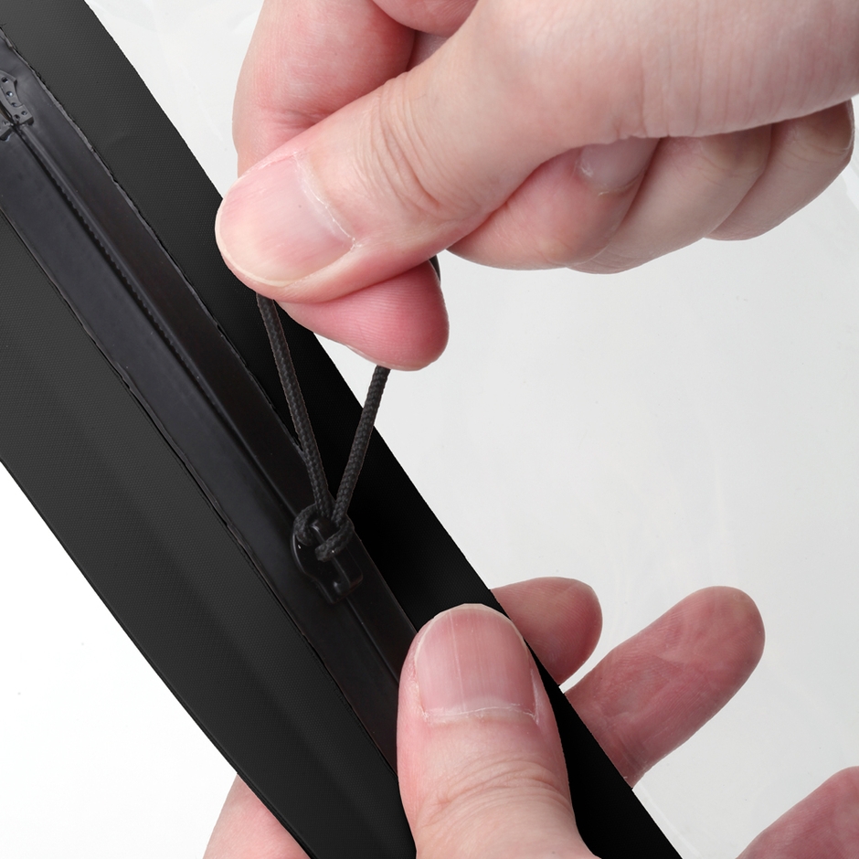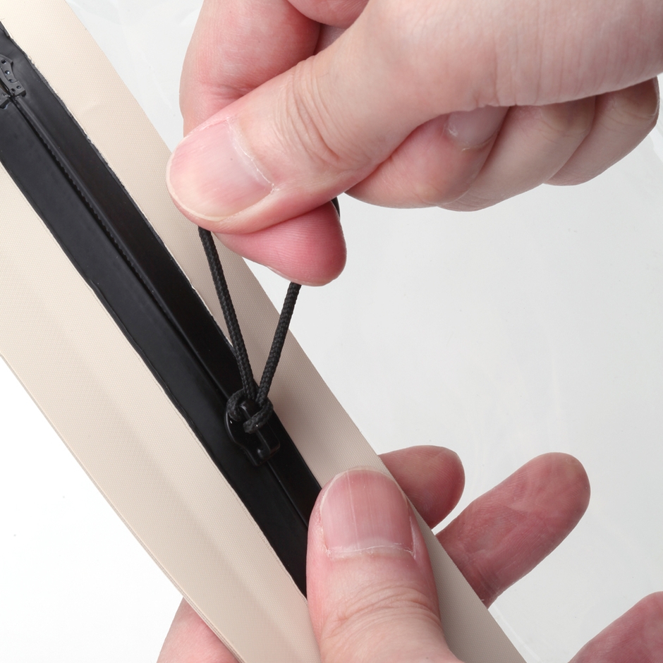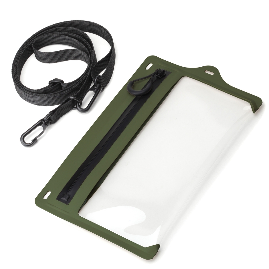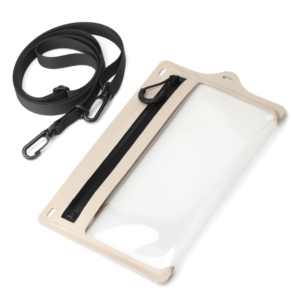 水の侵入を防ぐ気密ジッパーを採用し、IPX8相当の防水性能を備えた防水ポーチです。スマートフォンなどだけでなく、ちょっとした小物や鍵、小銭を収納するのにも便利です。