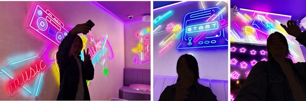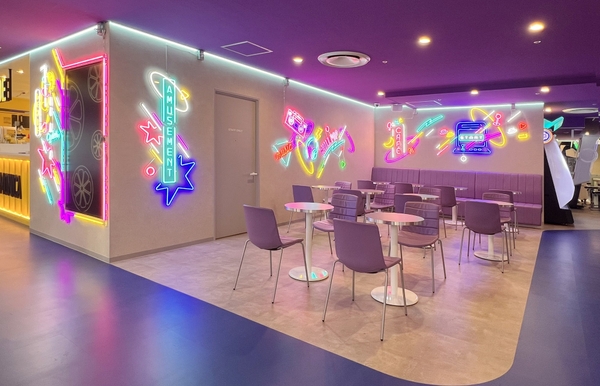 店内には、80年代のシティポップをイメージしてデザインしたLEDネオンサインを設置。煌めく光のコントラストが空間に奥行きを生み出し、レトロとモダンが融合する「Lofi & Chillout」の世界観を演出します。ディスプレイのオリジナル動画とも連動し、心地よく気分が高まる特別な空間を創り上げました。