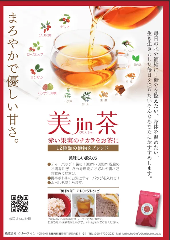 株式会社ビリーヴイン(所在地:秋田県秋田市、代表取締役:土田ゆき)は、12種類の植物をブレンドした新しい健康茶「美jin茶」(びじんちゃ)を、応援購入サービスMakuakeにて2024年5月15日から7月15日で先行販売を実施。目標の186%を達成しました。