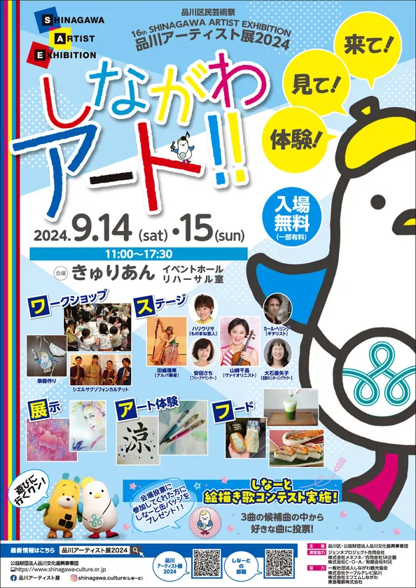 今年は、民族楽器アルパやヴァイオリンなど楽器演奏のステージ、品川アート活動応援マスコット「しなーと」の絵描き歌を決めるコンテストが実施されます。昨年好評だった「しなーと」&ケーブルテレビ品川マスコット「シナガワン」のコラボフォトタイムもあります。ひと息つけるフードコーナーも!
