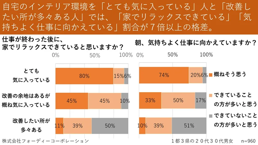 自宅の室内環境の満足度が仕事への意欲に影響する背景を探るために、仕事から帰宅後のリラックスの程度と、翌朝仕事に向かう際の精神状態について聞きました。