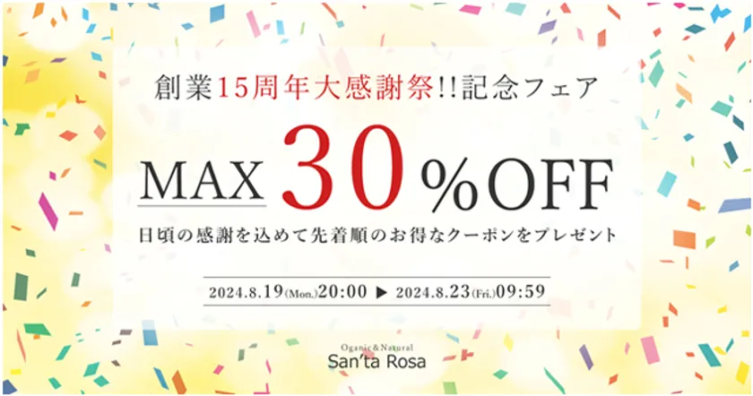 株式会社サンタローサ(本社:北海道札幌市、代表取締役:沼田 泰政)が運営する、オーガニックストア『San'ta Rosa(サンタローサ)』は、2024年8月19日(月)20:00から8月23日(金)9:59にわたり、楽天市場にて全品対象最大30%OFFとなるセールを実施します。