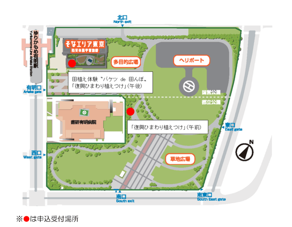 ◎ 本公園には一般駐車場はありません。公共交通機関または、周辺のコインパーキング等をご利用ください(但し、がん研有明病院の駐車場は利用できません)。
