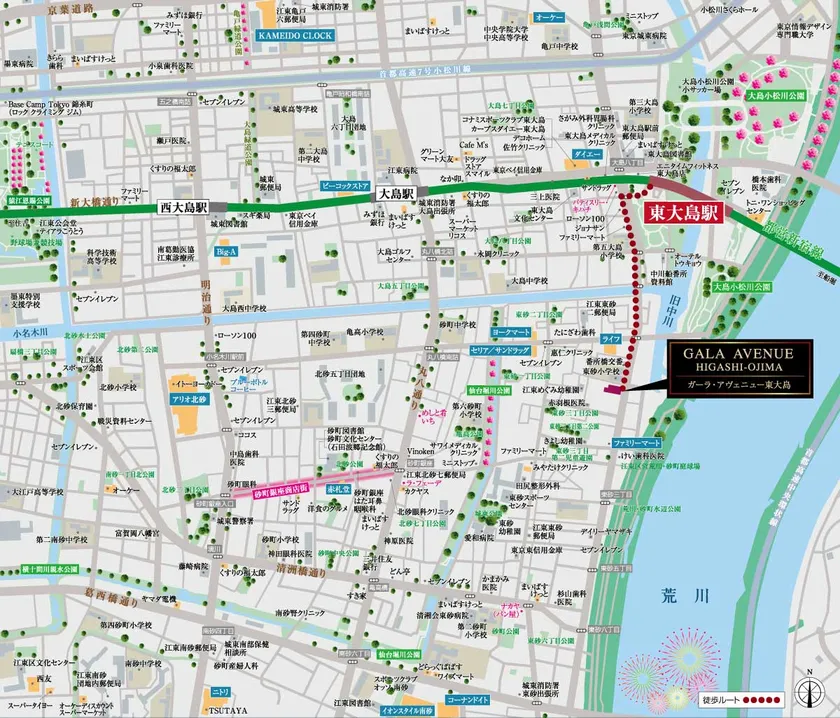 「ガーラ・アヴェニュー東大島」の周辺には、「アリオ北砂」や「ダイエー東大島店」などの大型商業施設が揃うほか、お花見スポットとしても人気な公園が点在。さらに徒歩圏内には、「ライフ東砂店」や「ヨークマート東砂店」をはじめとした日々の暮らしに欠かせない生活利便施設が充実するなど、自然に包まれながら利便性を享受できる魅力的な住環境が整っています。