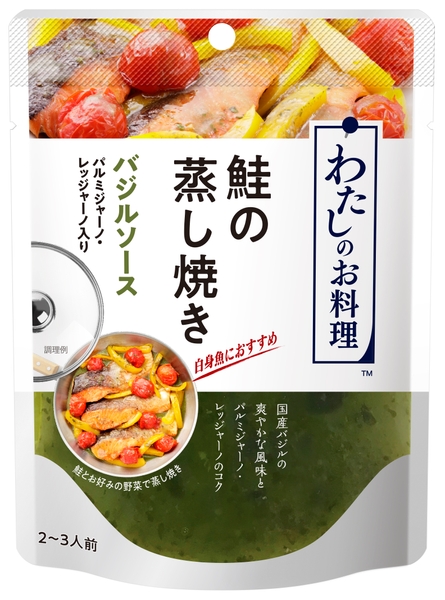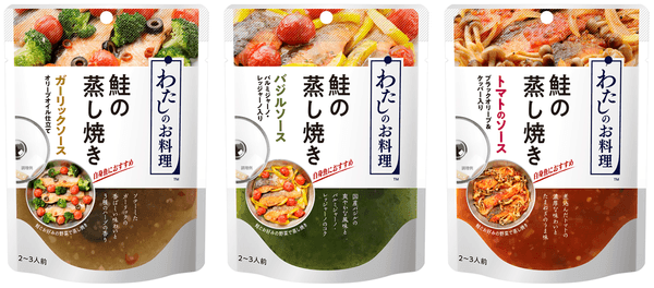 「わたしのお料理」ブランドの新商品「鮭の蒸し焼き」は、鮭の切り身と野菜を合わせフライパンで調理するだけで、ボリューム感のあるメインのおかずができる、蒸し焼き用ソースです。ラインアップは、「ガーリックソース オリーブオイル仕立て」「バジルソース パルミジャーノ・レッジャーノ入り」「トマトのソース ブラックオリーブ&ケッパー入り」の洋風ソース3品です。鮭と相性の良い原材料を使い、素材の味が重なり合った奥深い味わいです。