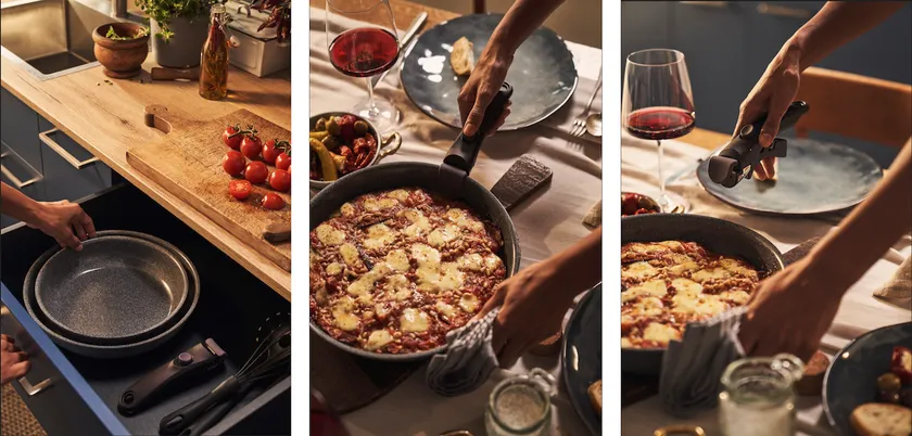 ワンタッチで付け外しが可能なため、スピーディーに取っ手を付けてフライパンとして普段の調理を行ったり、取っ手を外してオーブンを使ったお料理にもご使用いただけます。(耐熱温度230℃)また、調理だけではなく、熱々のお料理をそのまま食卓に出したり、残ったお料理を冷蔵庫で保存したり、後片付けも重ねてコンパクトに収納ができるなど多用途にお使いいただけます。