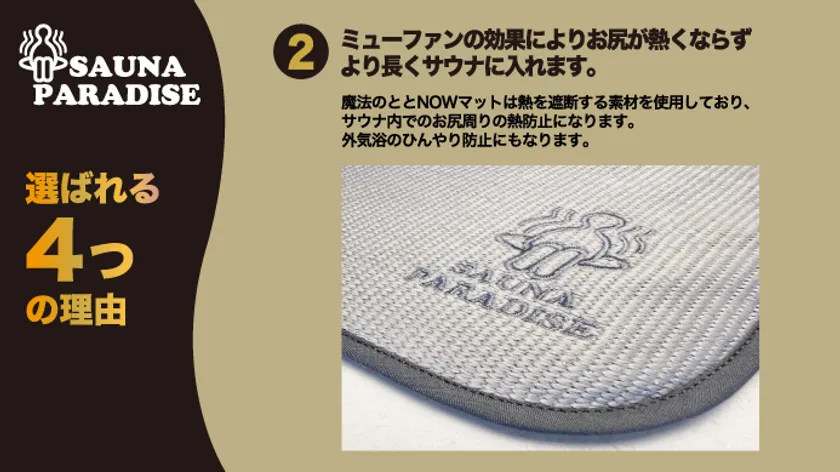 サウナ施設のサウナ用タオルが敷いてもかなり熱いサウナは良く遭遇するかとは思いますが、ミューファン(R)は断熱効果があり熱くならない素材です。さらには屋外での外気浴タイム、いきなり座ると冷やっとしますが、これを使うことでひんやりを予防になるのでサウナのトトノイタイムでゆったりと心地よくあなたを最高のトトノイへ導きます。