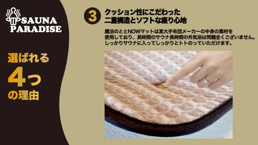 長い時間の間サウナに入る方はだんだんお尻が痛くなる方も少なくは無いかと思います。施設のマットを借りて熱くなったり、痒みが出たりしてサウナを上がることも少なからずあるかと思いますが、魔法のととNOWマットを使用すればよりトトノイに集中できます。