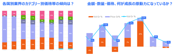 業界全体の規模、業界内の各カテゴリーの重要度、カテゴリーの成長率(金額、数量、価格)、カテゴリー別の価格帯推移、全メーカー別過去3年間の規模と成長率(最新3年間の年間トレンド)